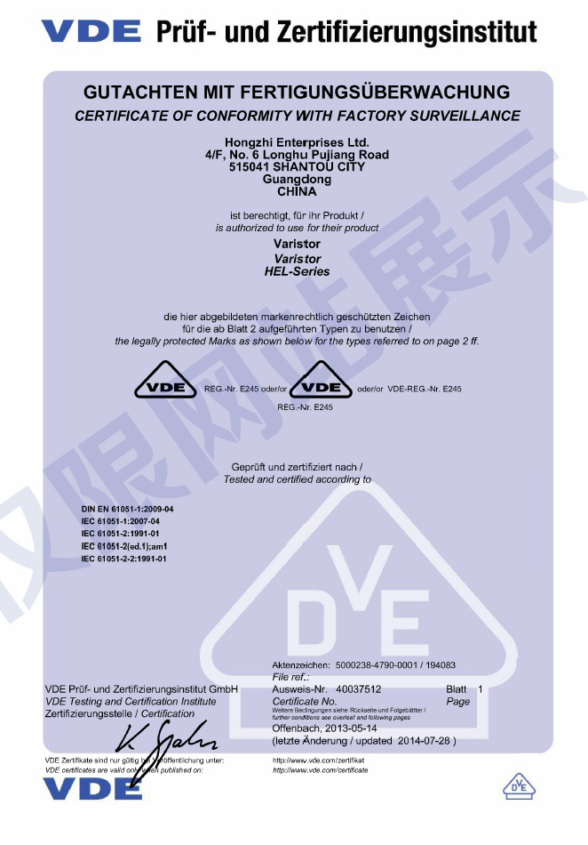 壓敏電阻是半導(dǎo)體元件。當(dāng)施加在壓敏電阻兩端的電壓從0至U1mA(壓敏電壓)時(shí),流經(jīng)壓敏電阻的電流≤1mA,壓敏電阻阻值較大,我們可以認(rèn)為在這一段壓敏是“絕緣體”;當(dāng)瞬間脈沖高壓入侵時(shí),脈沖電壓峰值超過(guò)壓敏電壓,壓敏電阻阻值迅速變小,動(dòng)作反應(yīng)時(shí)間小于20*10-9秒,壓敏“瞬間”變?yōu)椤皩?dǎo)體”。例如:當(dāng)壓敏兩端脈沖電壓峰值是壓敏電壓U1mA的2倍時(shí),壓敏的電阻值通常小于1Ω,它完全是導(dǎo)體了。